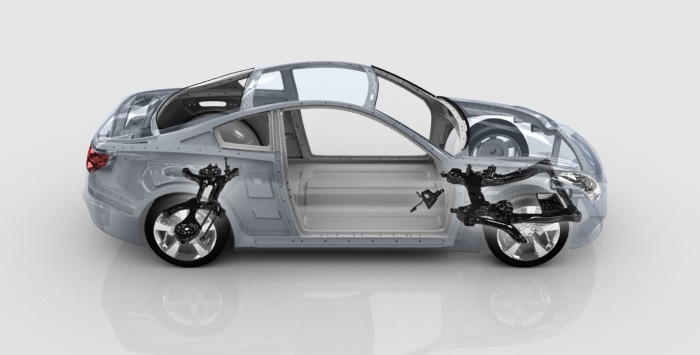 前輪側のサスペンションリンク類、ステアリングギアボックス、エンジン等の取り付け点をまとめて支持する骨格となる部品です。取り付け点を介して、タイヤからの様々な力に耐えうる強度、剛性が必要となり、衝突時の衝撃吸収も備えています。