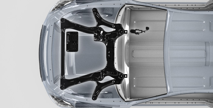 ボディの下に配置され、サスペンションリンク類、エンジン、デフ等のシャシー部品やボディをまとめて支持する骨格部品です。ボディや積荷の重量を支えるとともにタイヤからの様々な力に耐えうる強度、剛性が必要となります。